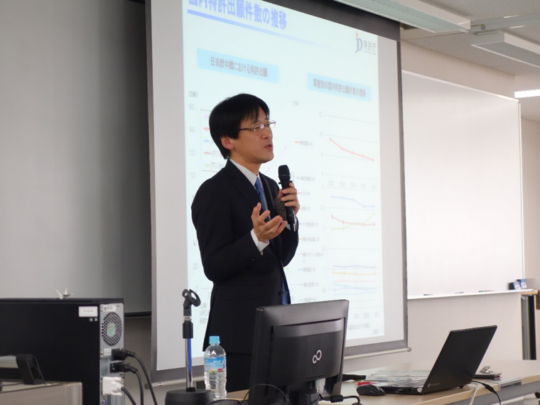 後谷部長の講演は、本年で10回目となりました。今回は国内特許出願件数の推移、知財活動費の動向、海外への特許出願動向などのほか、海外、特にインド、タイ、カンボジア、ラオス、ブルネイ、ミャンマー等アジア諸国への協力や日米共同調査試行プログラムなどをはじめとした各国特許庁との連携についてご説明いただきました。さらに、IoT、AIといった新しい技術潮流の中での特許行政の在り方の他、世界最速・最高品質の審査、審査の質の向上、INPIT近畿統括本部の設置、特許査定率の推移、特許料等の減免制度など、最近の特許政について、具体的な事例を含めご紹介いただきました。